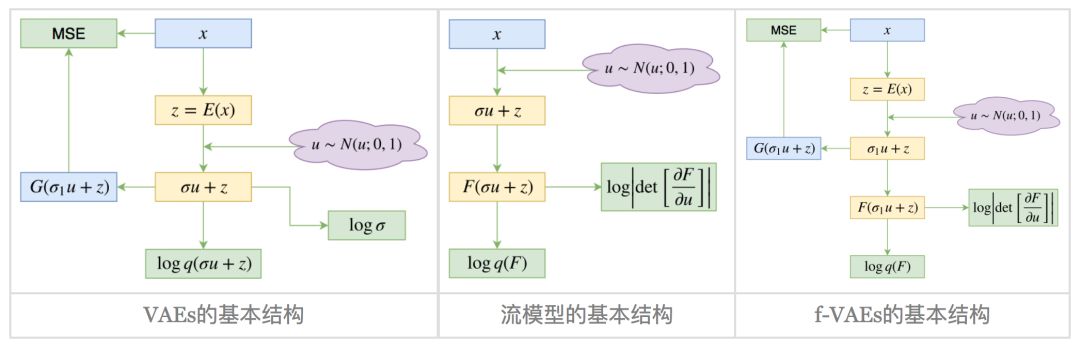 我们的解决思路是将流模型引入到 VAEs 中,用流模型来拟合更一般的后验分布 p(z|x) ,而不是简单地设为高斯分布,我们称之为 f-VAEs(Flow-based Variational Autoencoders,基于流的变分自编码器)。