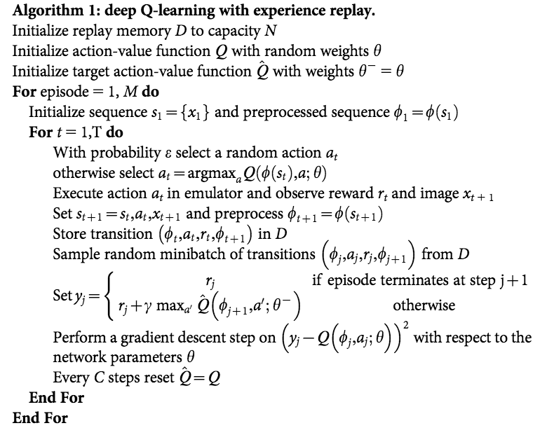 上期详细讲解了DQN中的两个重要的技术:Target Network 和 Experience Replay,正是有了它们才使得 Deep Q Network在实战中容易收敛,以下是Deepmind 发表在Nature 的 Human-level control through deep reinforcement learning 的完整算法流程。