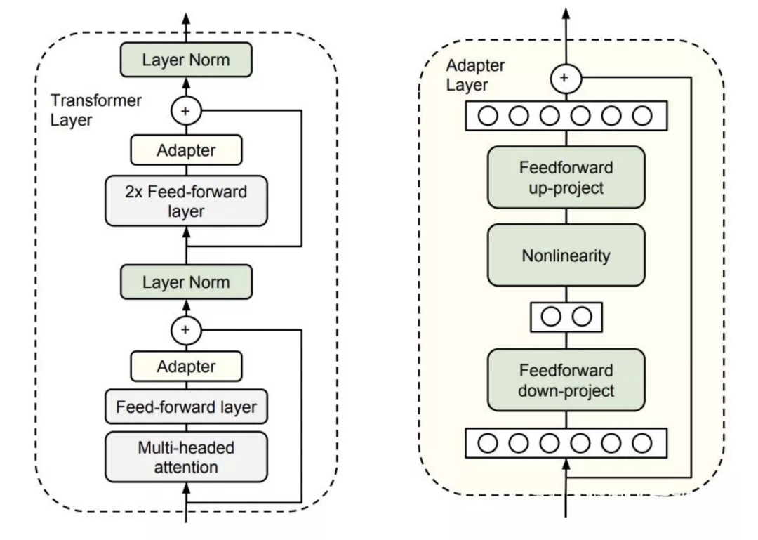 本文提出的高效fine-tune的灵感来自于Adapter-Tuning in NLP,这篇工作的思路是将 Adapter (下图中黄色方块,为bottleneck状的两层FFN网络)加入到 Transformer 中,在针对某个下游任务微调时,仅仅改变 Adapter 的参数。
