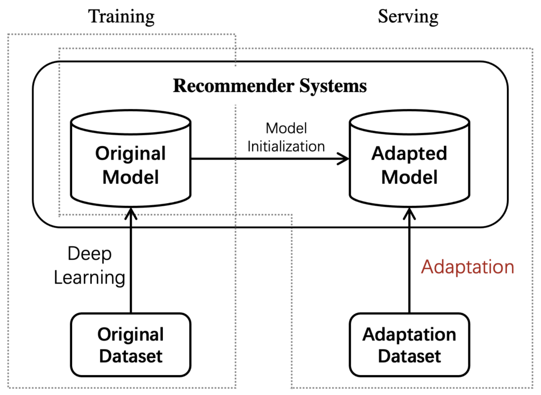 在线服务【Online Service】:线上应用线下已经训练好的推荐模型进行服务时,往往因为数据分布不一致(offline-online inconsistency)导致在线服务效果不好。频繁收集线上数据并在线下重新训练模型并不是一个高效的办法。一个比较自然的想法是应用模型自适应,通过捕捉线上数据的分布特征,调整原始模型,来适应到线上场景,减轻线上线下数据不一致带来的负面影响,以达到更好的线上服务效果。