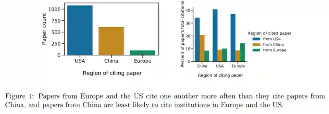 根据图表显示,我们可以看出美国和中国的论文在多大程度上没有引用对方的文章。从中国对美国论文的引用量来看,虽然美国论文占了数据集的 60%(总共 1792 篇,图 1 左显示美国大约 1100 篇),但它们被中国论文引用的数量只占 34%(图 1 右)。