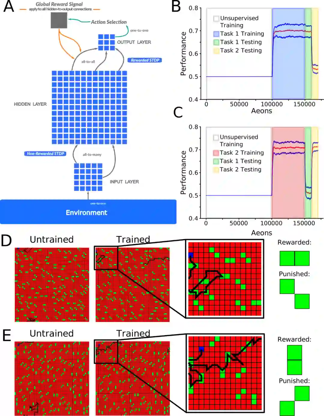 图 1A 显示了一个前馈脉冲神经网络,用于模拟信号从输入到输出。位于输入层 (I) 和隐藏层 (H) 之间的神经元接受无监督学习 (使用非奖励 STDP),H 层和输出 (O) 层之间的神经元则接受强化学习 (使用奖励 STDP 实现)。