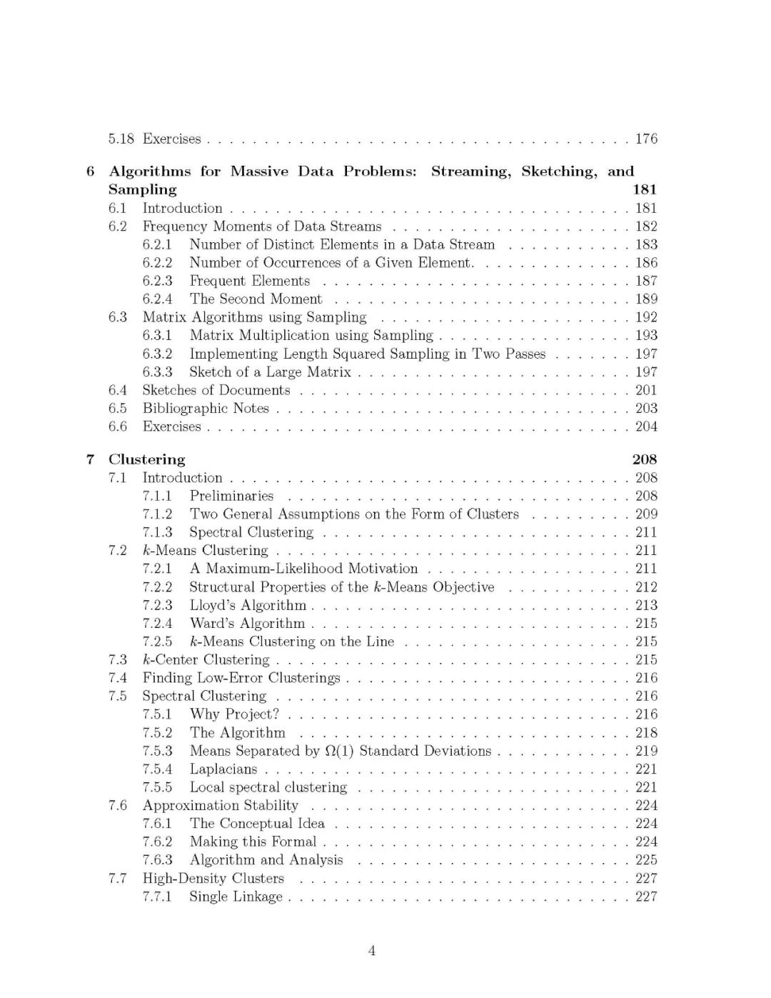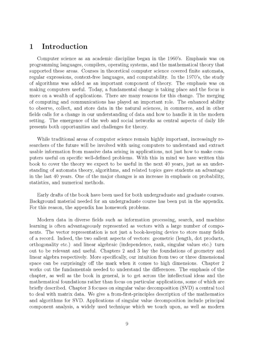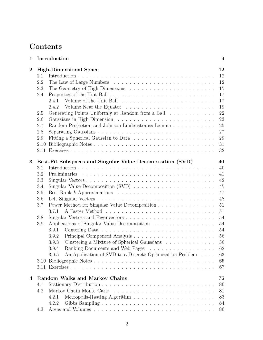 这本书介绍了数据科学的数学和算法基础,包括机器学习,高维几何,和大型网络的分析。主题包括高维数据的反直觉性质,重要的线性代数技术,如奇异值分解,随机漫步和马尔科夫链理论,机器学习的基本原理和重要算法,聚类算法和分析,大型网络的概率模型,表示学习包括主题建模和非负矩阵分解、小波和压缩感知。发展了重要的概率技术,包括大数定律、尾不等式、随机投影分析、机器学习中的泛化保证,以及用于分析大型随机图中的相变的矩方法。此外,还讨论了矩阵规范和vc维等重要的结构和复杂性度量指标。这本书适合本科和研究生课程的设计和分析算法的数据。