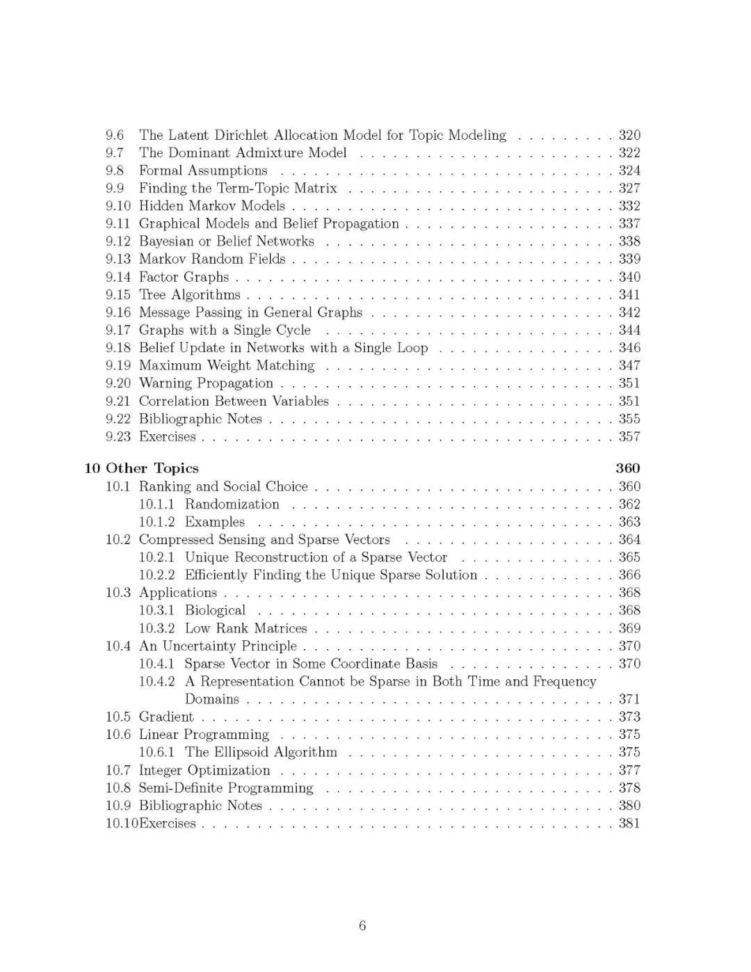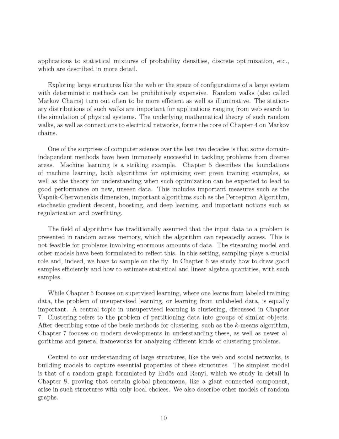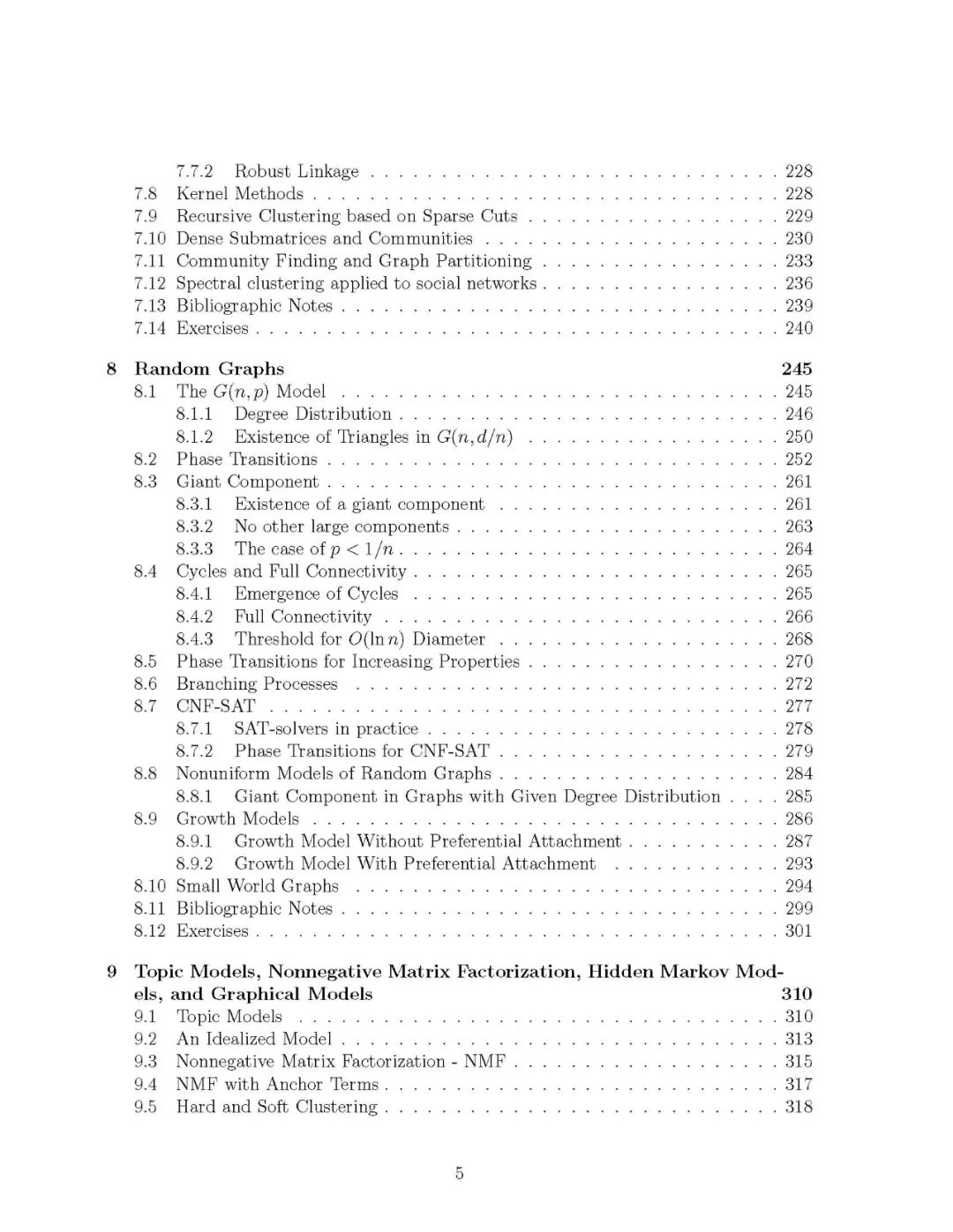 这本书介绍了数据科学的数学和算法基础,包括机器学习,高维几何,和大型网络的分析。主题包括高维数据的反直觉性质,重要的线性代数技术,如奇异值分解,随机漫步和马尔科夫链理论,机器学习的基本原理和重要算法,聚类算法和分析,大型网络的概率模型,表示学习包括主题建模和非负矩阵分解、小波和压缩感知。发展了重要的概率技术,包括大数定律、尾不等式、随机投影分析、机器学习中的泛化保证,以及用于分析大型随机图中的相变的矩方法。此外,还讨论了矩阵规范和vc维等重要的结构和复杂性度量指标。这本书适合本科和研究生课程的设计和分析算法的数据。