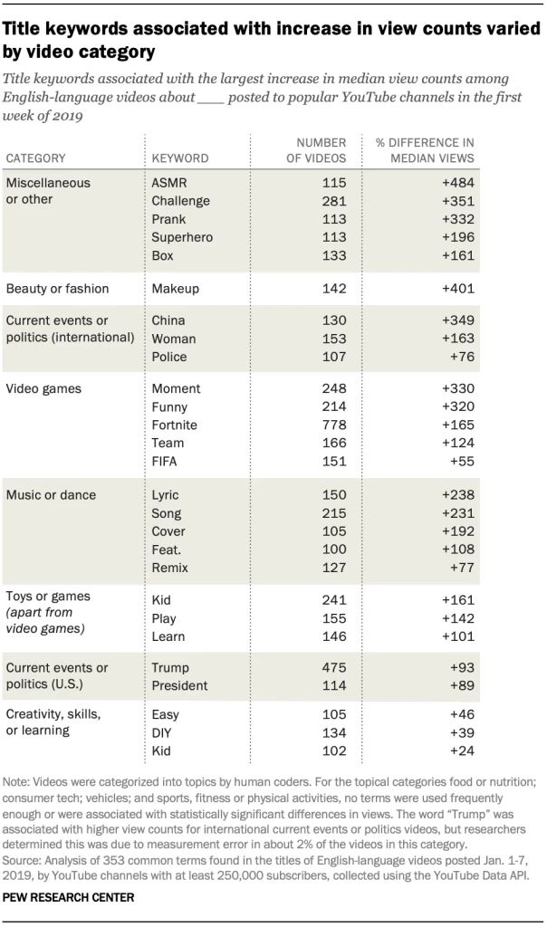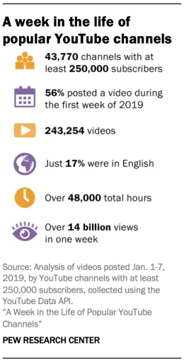 皮尤研究院(Pew Research Center)在7月底发布了一份对YouTube上4万多名粉丝数超25万的博主的研究,相比于方法论,