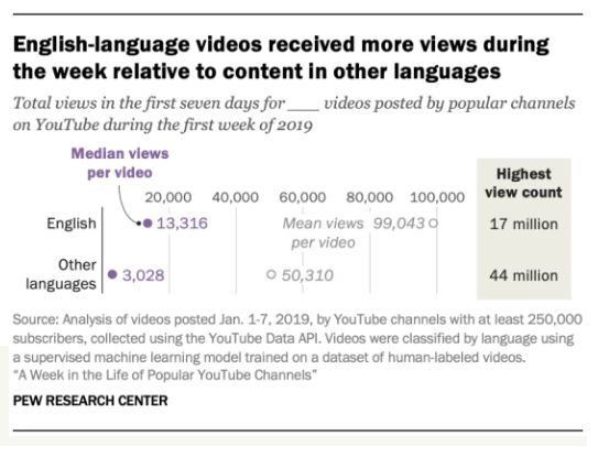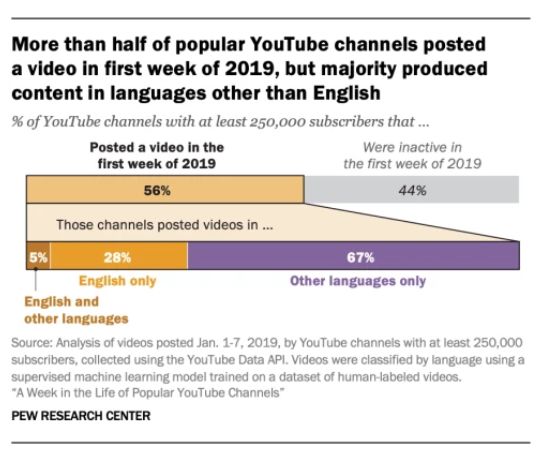 2. YouTube的流行是全球性的,最火爆的内容来自于一个非英语频道。通过手动标记和机器学习的方式分辨视频的语言发现,统计周期内,56%的博主都发布了视频,其中72%的博主至少发布了一个非英语视频。仅有17%的视频为全英文,约4.25万条。