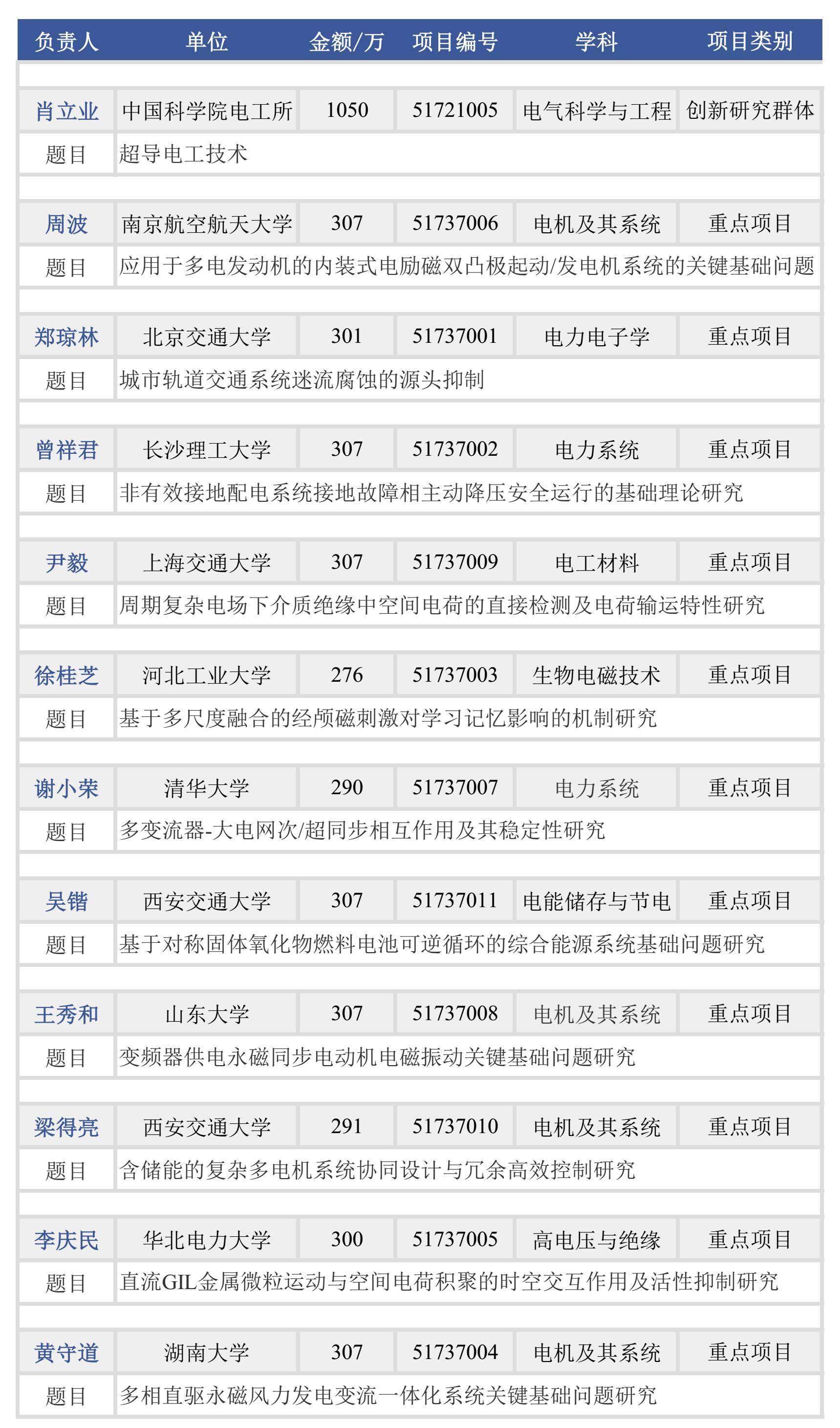 2017年国家自然科学基金NSFC项目评审结果近日揭晓。38项创新研究群体项目,83个国家重大科研仪器研制项目,667个重点项目获得资助。其中,电气科学与工程领域内的科学家共斩获创新群体项目1个,重点项目11个。