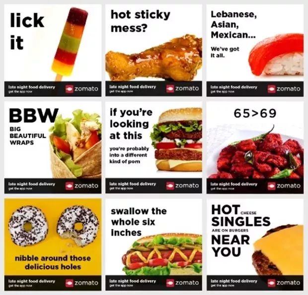 和老罗面临的状况一样, Zomato团队也需要考虑广告创意如何和不可描述的内容相得益彰,经过精心考虑,他们最终制作出了风格非常匹配的广告创意:看得懂的老司机们会明白这些文案的意义,看不懂的小清新们通过这些“性感”的图片也能充分理解广告的含义。