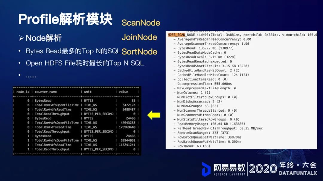 Node分为ScanNode、JoinNode、SortNode。上图是典型的HTFS_SCAN_NODE,它包含了很多的指标。从截图中看到,像读取的字节数,本地读取的字节数,读取的函数等等,这块都是有展示的。我们将这些指标都提取出来,然后解析成一条一条的记录存储到Mysql表当中。