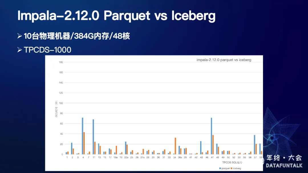 我们将基本的建表和查询功能backup到了2.12.0版本,与parquet进行了对比,测试环境为10台384G、48核的物理机,数据集为TPCDS-1000,测试结果如下:
