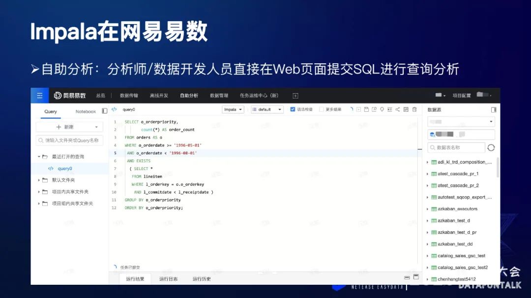 导读:Impala是Cloudera公司主导开发的交互式查询系统,它提供SQL语义和计算能力,但是本身并不存储数据。本次分享会聚焦于Impala在网易内部的一些新实践,以及基于Impala 3.4版本所做的优化和改进。