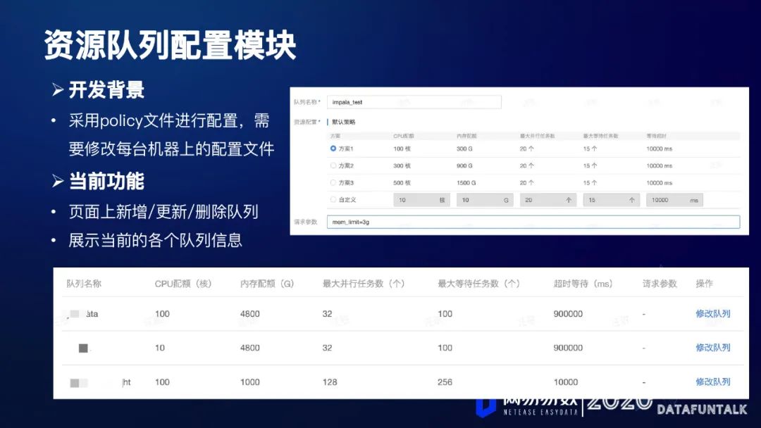 在Impala2.12的时候,采用policy文件进行配置,需要修改每台机器上的配置文件,新增或者修改一个队列的话,就需要在所有的机器上把配置文件进行修改(可以只配置coordinator),这样比较麻烦,不利于运维。基于这个情况,我们就开发了资源对列配置模块。主要有以下这些功能:
