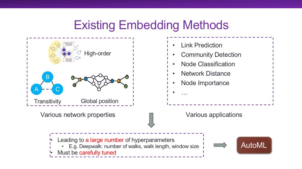 为了保持网络中各种各样的性质,网络表征学习通常含有大量的超参数。这些超参数通常需要严格的设置以达到良好的效果。大规模网络数据给网络嵌入的超参数优化带来了巨大的挑战。我们提出了一个新的框架AutoNE,来自动的优化网络嵌入算法中的超参数。具体地,我们利用了一个多源随机游走来采样多个子网络,设计一个元学习器来从子网络传递关于超参数的知识到原始的大图。传递过来的元知识能极大的减少搜索最优超参数的次数。大量的实验表明我们的框架能显著的优于现有的方法。