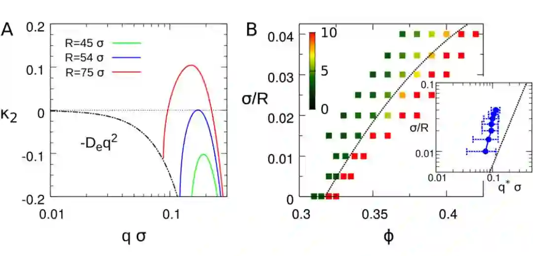 图5:(A)不同旋转半径下,不同波长下微扰的成长速率(growth rate)和波矢量q的关系。q不为零处正的成长速率表示体系在有限尺度发生失稳(微观相分离)。(B)理论预测(虚线)的失稳密度(大图)和失稳波矢量q*(小图)随着粒子旋转半径R的变化与模拟数据(实点)的对比。