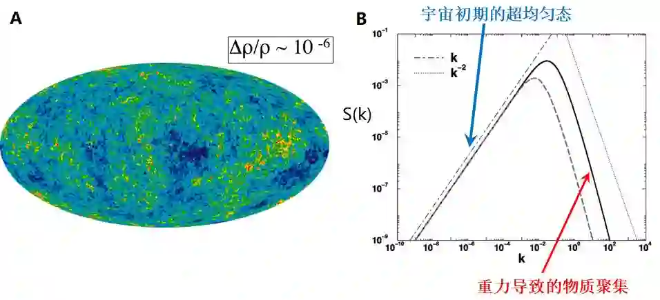图6:(A)宇宙微波背景辐射示意图和其观察到的宇宙涨落强度。(B) 标准宇宙模型预测宇宙结构因子S(k),k为波矢量。