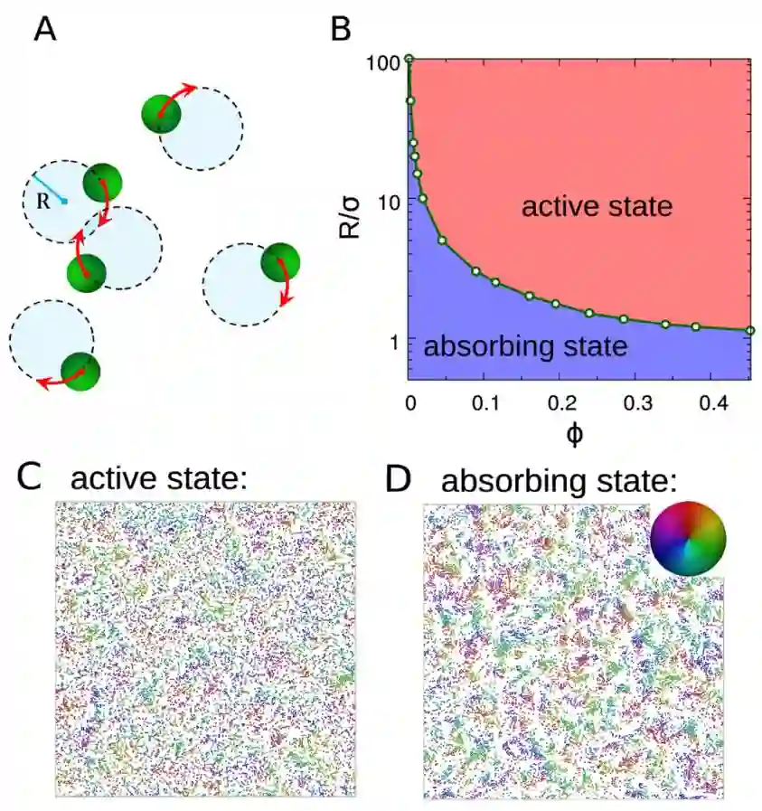 图3:(A)研究模型。(B)体系相图(x轴表示密度,y轴旋转半径)(C)活力超均匀态(active state)示意图。(D) 吸收态(absorbing state)示意图。其中粒子颜色代表粒子的运动方向。