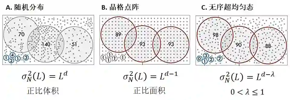 的标度指数λ刻画(d为维度)。λ=0意味着体系的粒子数涨落正比于粒子数N~Ld,即泊松过程或随机分布(图A); 而λ=1则意味体系有着晶体般的超均匀性(图B)。0<λ≤1都属于超均匀态。(图片编辑自[1])