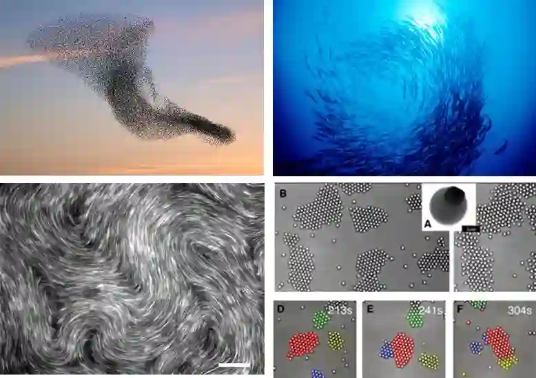 图2:几种常见的活性物质体系(按顺序):鸟群,鱼群,细胞微丝,自驱动胶体粒子。极度的不均匀和巨大的密度涨落是活力物质的特性之一。(图片来自网络)