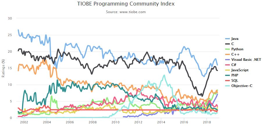 TOP 10 编程语言 TIOBE 指数走势(2002-2018)