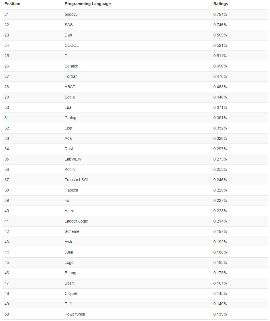 (Visual) FoxPro, ABC, ActionScript, Alice, APL, BBC BASIC, bc, Bourne shell, C shell, CoffeeScript, Common Lisp, cT, Elixir, Forth, Hack, Icon, IDL, Inform, Io, J, J#, Korn shell, LiveCode, Maple, Mercury, ML, Modula-2, Monkey, MOO, MQL4, NATURAL, NXT-G, OCaml, OpenCL, Oz, PostScript, Q, Ring, RPG, S, Smalltalk, SPARK, Standard ML, Stata, Tcl, TypeScript, VBScript, Verilog, VHDL, Wolfram