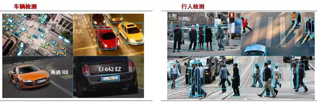 2)识别行人车辆。基于深度学习的行人检测算法能够在各类遮挡的情况下精确找出行人位臵,并能够进一步分析行人姿态和动作,可应用于交通监控、辅助驾驶、无人驾驶等。可以在行车场景、交通监控场景、卡口场景中检测多种不同角度的车辆,并同时给出车牌号码、汽车品牌、型号、颜色等物理特征。