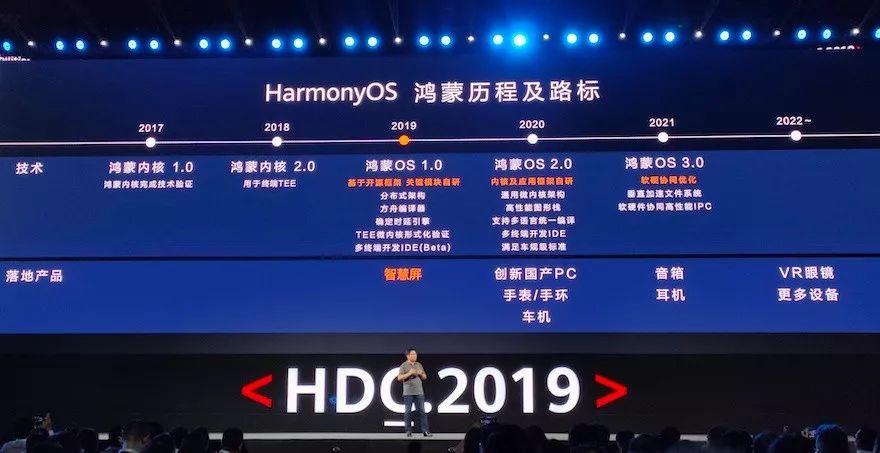 2020年,鸿蒙OS 2.0将实现内核及应用框架自研,通用微内核架构,延伸出创新国产PC手表/手环、车机,2021年及以后,鸿蒙OS 3.0实现软硬协同优化,衍生出音箱、耳机、VR眼镜等更多设备。