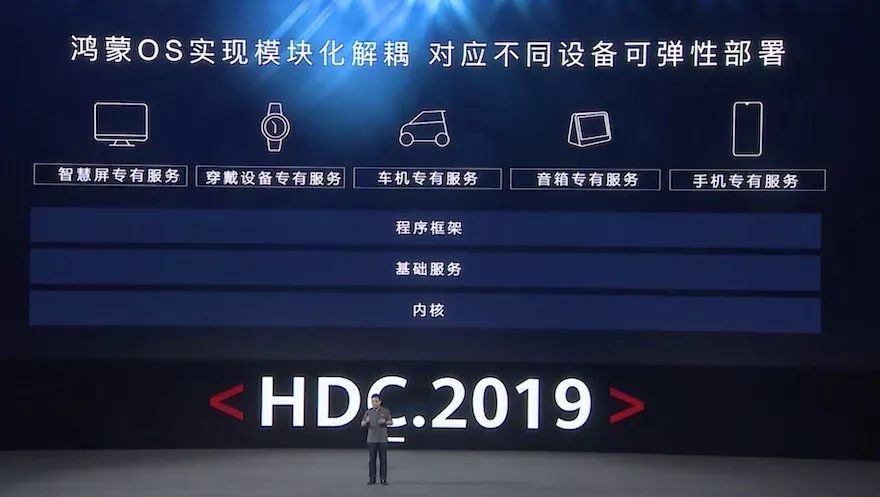 首先看我们架构。这是鸿蒙 OS 架构,最底层是内核层,上面是基础服务层、程序框架,通过这些东西,支撑不同设备,包括智慧大屏、穿戴、车机、音响、手表、手机、PC 等等各种各样设备。