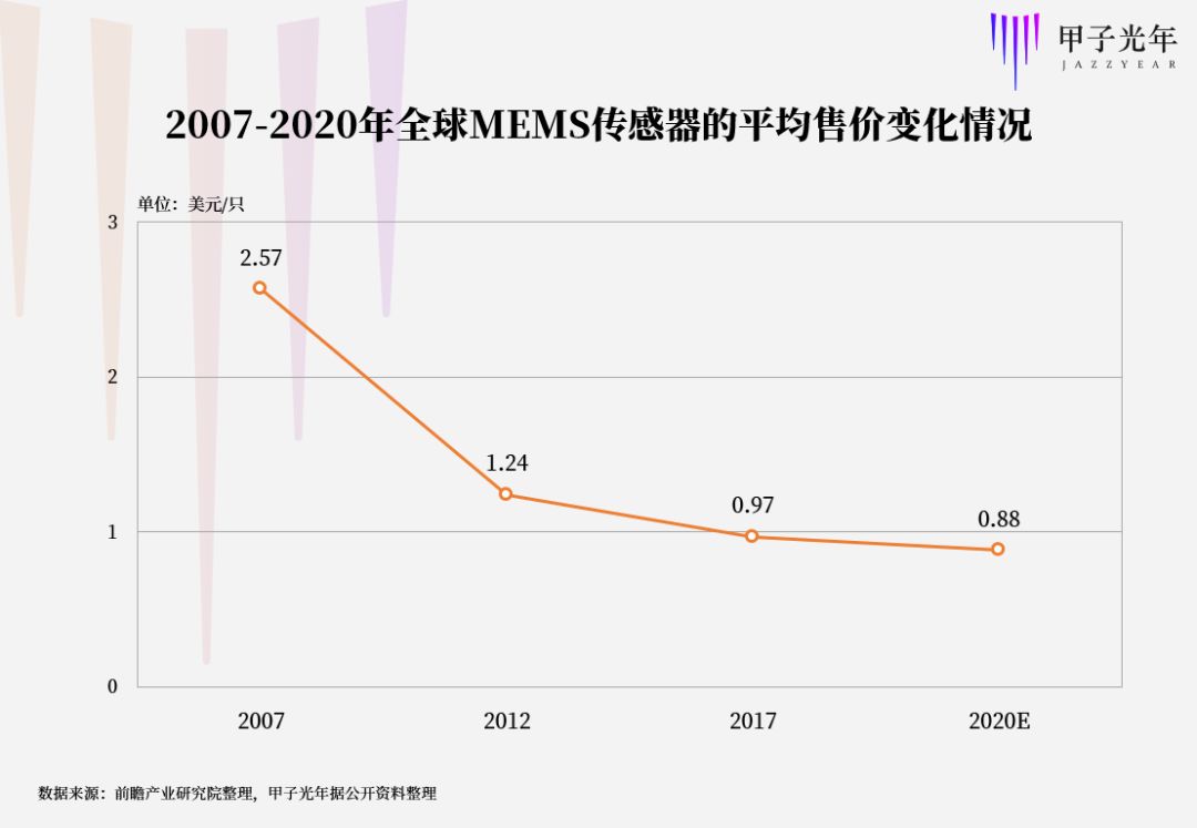 2007年-2020年全球MEMS传感器的平均售价变化情况(单位:美元/只)
