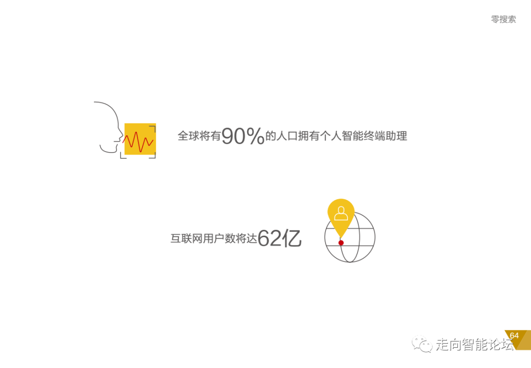 受益于人工智能及物联网技术,智能世界将简化搜索行为和搜索按钮,带给人类更为便捷的生活体验:从过去的你找信息,到信息主动找到你;未来,不需要通过点击按钮来表达你的需求,桌椅、家电、汽车将与你对话。