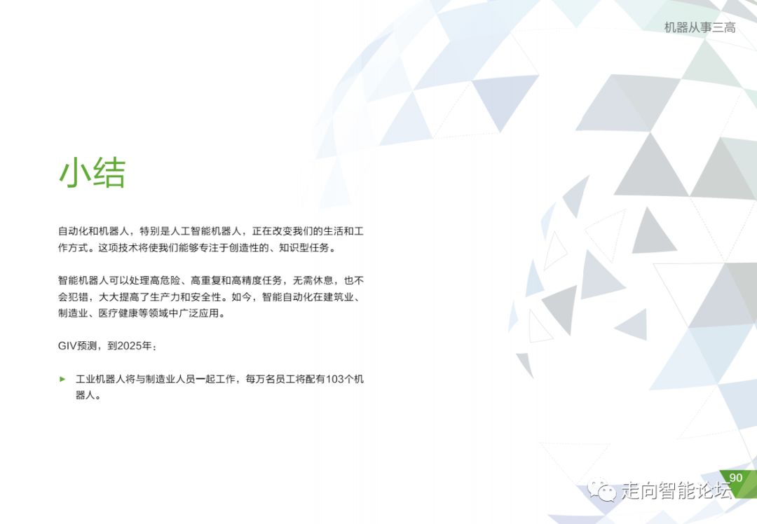 自动化和机器人,特别是人工智能机器人,正在改变我们的生活和工作方式,他们可以从事处理高危险、高重复性和高精度的工作,无需休息,也不会犯错,将极大提高生产力和安全性。如今,智能自动化在建筑业、制造业、医疗健康等领域中广泛应用。