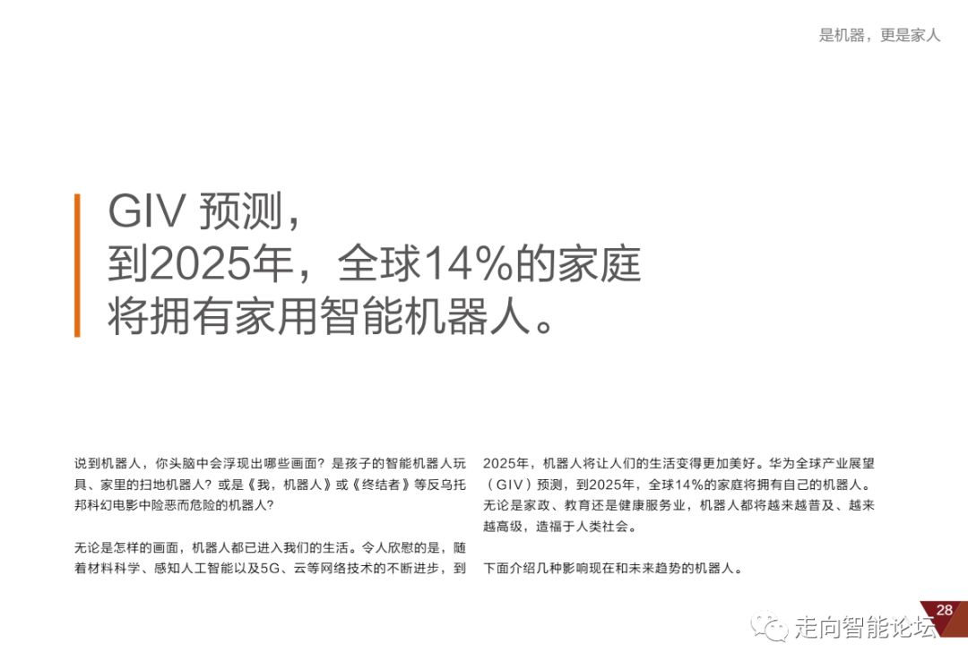 华为今日发布全球产业展望GIV@2025,基于对交通、零售、金融、制造、航空等17个重点行业的案例研究,提出智能世界正在加速而来,触手可及,并预测:到2025年,智能技术将渗透到每个人、每个家庭、每个组织,全球58%的人口将能享有5G网络,14%的家庭拥有“机器人管家”,97%的大企业采用AI。文末附166页报告全文PDF下载。本文综合来自:华为,报告版权归华为所有,由《走向智能论坛》公号小智整理。