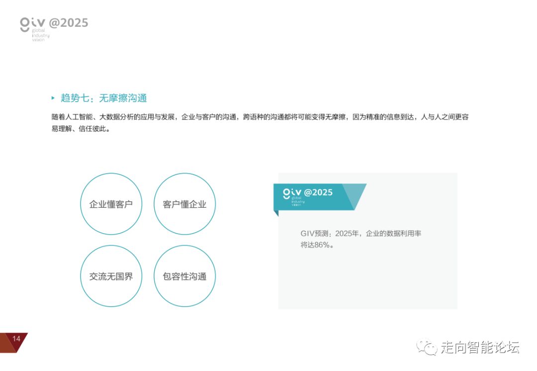 随着人工智能、大数据分析的应用与发展,企业与客户的沟通、跨语种的沟通都将可能变得无摩擦,因为精准的信息到达,人与人之间更容易理解、信任彼此。