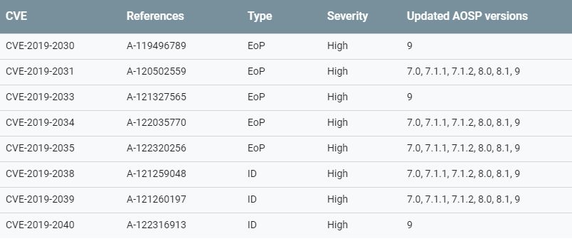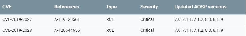 其中,存在最高等级风险的是位于媒体框架(media framwork)中的一个严重安全漏洞,它可以使攻击者传送更改后的文件,从而在拥有权限的情况下远程执行任意代码。CVE-2019-2027 和 CVE-2019-2028 都包含在这一媒体框架内。