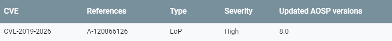 CVE-2019-2026 所在的 Android 框架中的部分漏洞可以使本地攻击者通过用户交互获得额外权限。其余几项位于运行系统中,其中严重的漏洞可能会使本地恶意应用程序取得权限,执行任意代码。