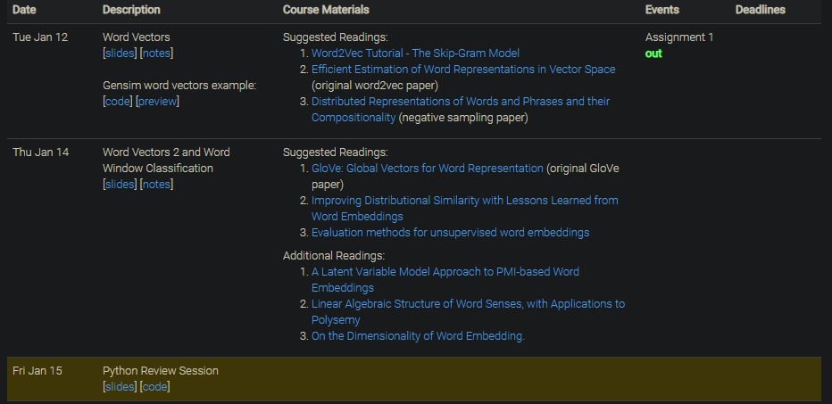 在 1 月份的课程安排中,学生将学习到词向量、Gensim 词向量示例、 词窗口分类、Python 知识回顾、反向传播和神经网络、依存句法分析、PyTorch 知识回顾、梯度消失、Fancy 循环神经网络和 Seq2Seq 等。