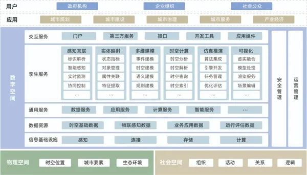 从技术视角,需对物理空间以及社会空间中的物理实体对象、事件对象以及关系对象进行数字空间的虚拟表达以及映射,通过信息基础设施的转化传输以及处理形成数据资源,在通用服务能力的支撑下进一步融合数字孪生技术形成能够对外提供的数字孪生服务,并通过交互服务实现与上层应用场景的融合。同时,需提供立体化安全管理以及全生命周期的运营管理,保障数字空间各类资产以及服务的安全高效运行。