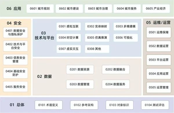 当前,城市数字孪生标准化处于起步阶段,亟需开展标准体系顶层设计。白皮书探索构建了“城市数字孪生标准体系总体框架(1.0版)”,将城市数字孪生标准划分为“01总体”“02数据”“03技术与平台”“04安全”“05运维/运营”“06应用”六大类。