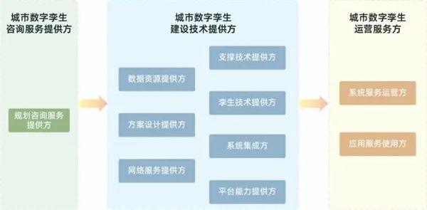 从相关方视角,城市数字孪生由城市数字孪生咨询服务提供方、建设技术提供方、运营服务方三方多类主体联动构建。