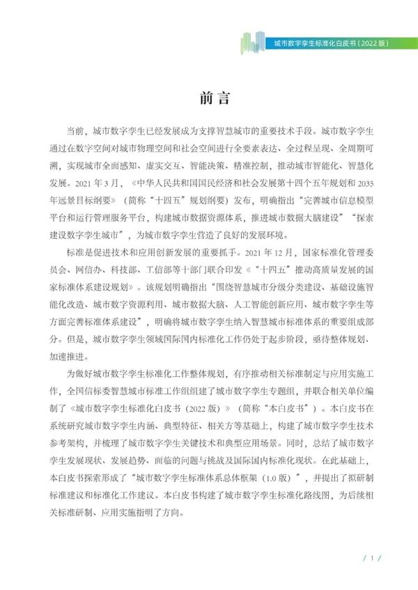 当前,城市数字孪生已经发展成为支撑智慧城市的重要技术手段。为做好城市数字孪生标准化工作整体规划,有序推动相关标准制定与应用实施工作,全国信标委智慧城市标准工作组组建了城市数字孪生专题组,并联合相关单位编制了《城市数字孪生标准化白皮书(2022版)》。