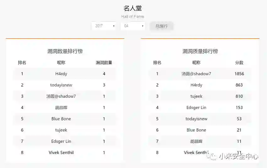 在2017年4月,共有8位国内外安全专家,通过小米安全中心(MiSRC)反馈了有效的安全漏洞和威胁情报。感谢这8位国内外安全专家,对小米安全的支持和保障。