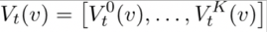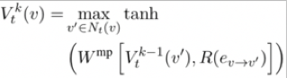 t时刻知识图谱中每个节点的向量表示为V_t(v),向量表示中包含了以下来源的信息:代理私有知识库的信息,共享的对话中的信息,来自知识库中相邻节点的信息
