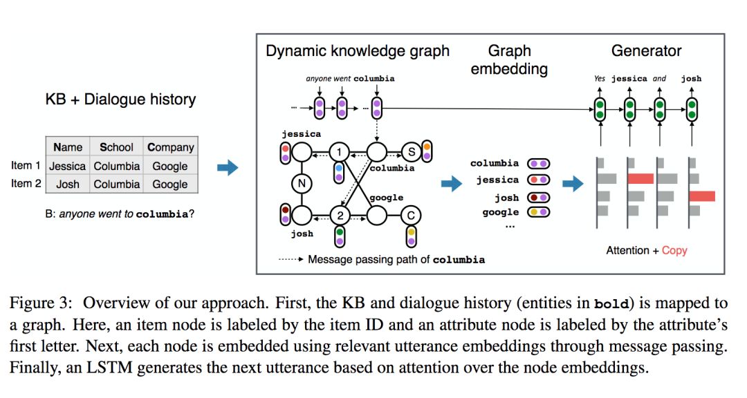 文本研究了对称合作对话(symmetric collaborative dialogue)任务,任务中,两个代理有着各自的先验知识,并通过有策略的交流来达到最终的目标。本文还产生了一个11k大小的对话数据集。为了对结构化的知识和非结构化的对话文本进行建模,本文提出了一个神经网络模型,模型在对话过程中对知识库的向量表示进行动态地修改。