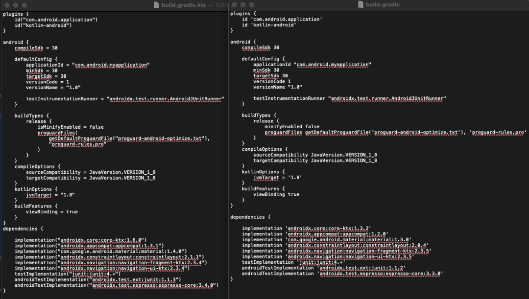 Gradle DSL 支持使用 Groovy 与 Kotlin 脚本编写构建文件。到目前为止,我都在使用 Groovy DSL 脚本来配置此工程的构建。您可以在下面看到分别由 Kotlin 和 Groovy 编写的相同构建文件。注意 Kotlin 脚本文件名后缀为 ".kts"。