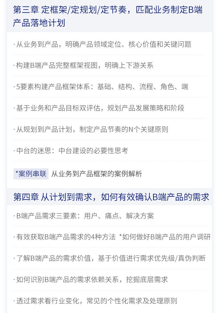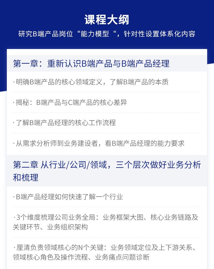 除此之外,B端产品经理除了掌握核心工作技能外,还需要具备极强的抽象能力、沟通协作、技术理解力,这些我们的课程中也给到了可以落地的方法。详细看大纲感受一下。