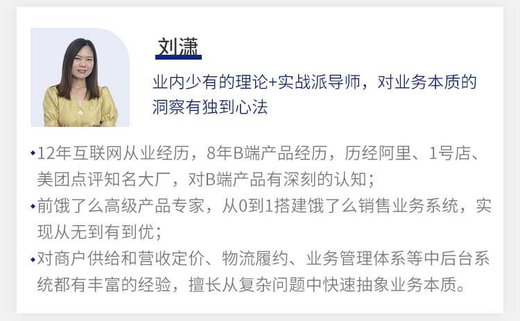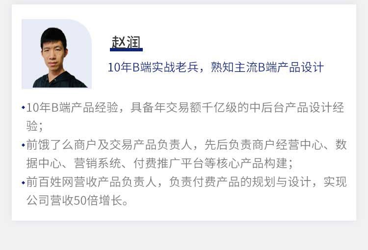 首期课程将由饿了么高级产品专家@刘潇、交易/商户系统产品负责人@赵润共同担任主讲老师,基于B端产品经理的能力模型,构建可复用的B端产品建设的系统方法论。