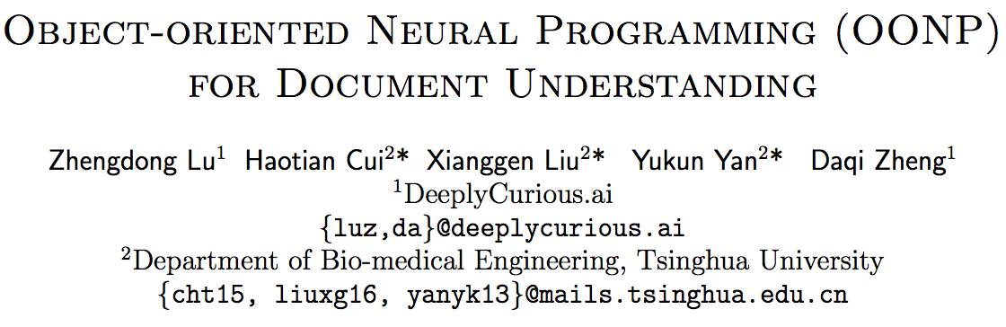 深度好奇(DeeplyCurious.ai)近日在 arXiv 上发布的论文提出了一种基于神经符号智能(Neural-symbolic)的特定领域文本解析框架:Object-oriented Neural Programming(OONP)。