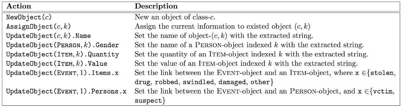 作者在三个数据集上对模型的性能进行了实验。以公安报案数据为例,OONP 使用了如图 6 中列举的 action。