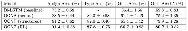图 7 比较了 OONP 的不同实现:论文衡量模型性能用了四个指标,Assign Acc 表示预测对象「新增和指派」的正确率,Type Acc 表示预测对象属性的正确率,Ont Acc 表示单个样本解析的本体结构和标签 100% 重合的正确率,Ont Acc-95 表示单个样本解析的本体结构和标签 95% 重合的正确率。简单的 OONP 模型较以 Bi-LSTM 为基准模型有很大提升,具有丰富结构信息的 OONP(structured)则又有明显提升。而在 OONP(structured)的基础上,用强化学习来决定分类时机的模型 OONP(RL)则又进一步提高了效果。
