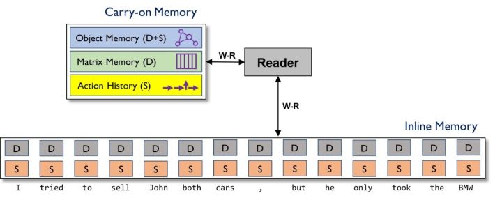 携带记忆(Carry-on Memory)模块可分为对象记忆(Object Memory)、矩阵记忆 (Matrix Memory) 和动作历史 (Action History) 三部分。对象记忆存储针对对象的具体表示,对象的内部属性可以有不同的形式,比如字段或者类别,同时也对应着不同的形成方式:字段一般是从原文复制粘贴过来,类别则是通过分类模块得到的。同时,每个对象也有可动态调整的可微分表示(object embedding)作为其与其他模块交互的接口。当 OONP 每次读到文本中针对某个对象的描述,就会对对象记忆中该对象的相关部分信息中进行更新操作。