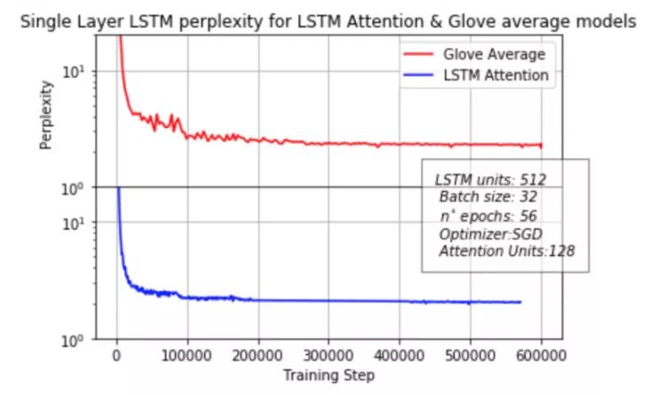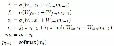 其中 f 是遗忘门,i 是输入门,o 是输出门,m 是存储器输出,W 是可训练矩阵。单词预测是通过输出词汇表中每个单词的概率分布的 softmax 层进行的。